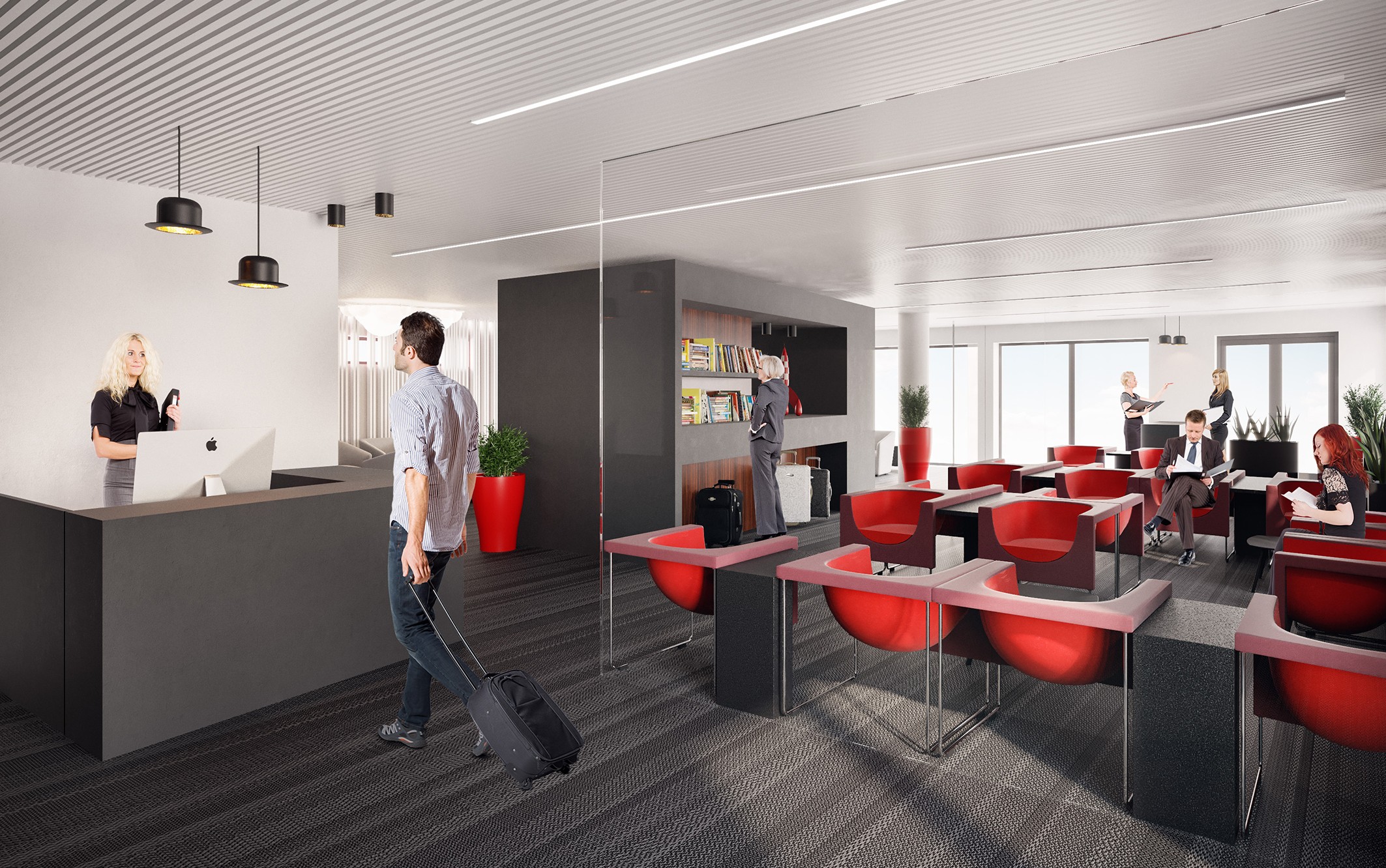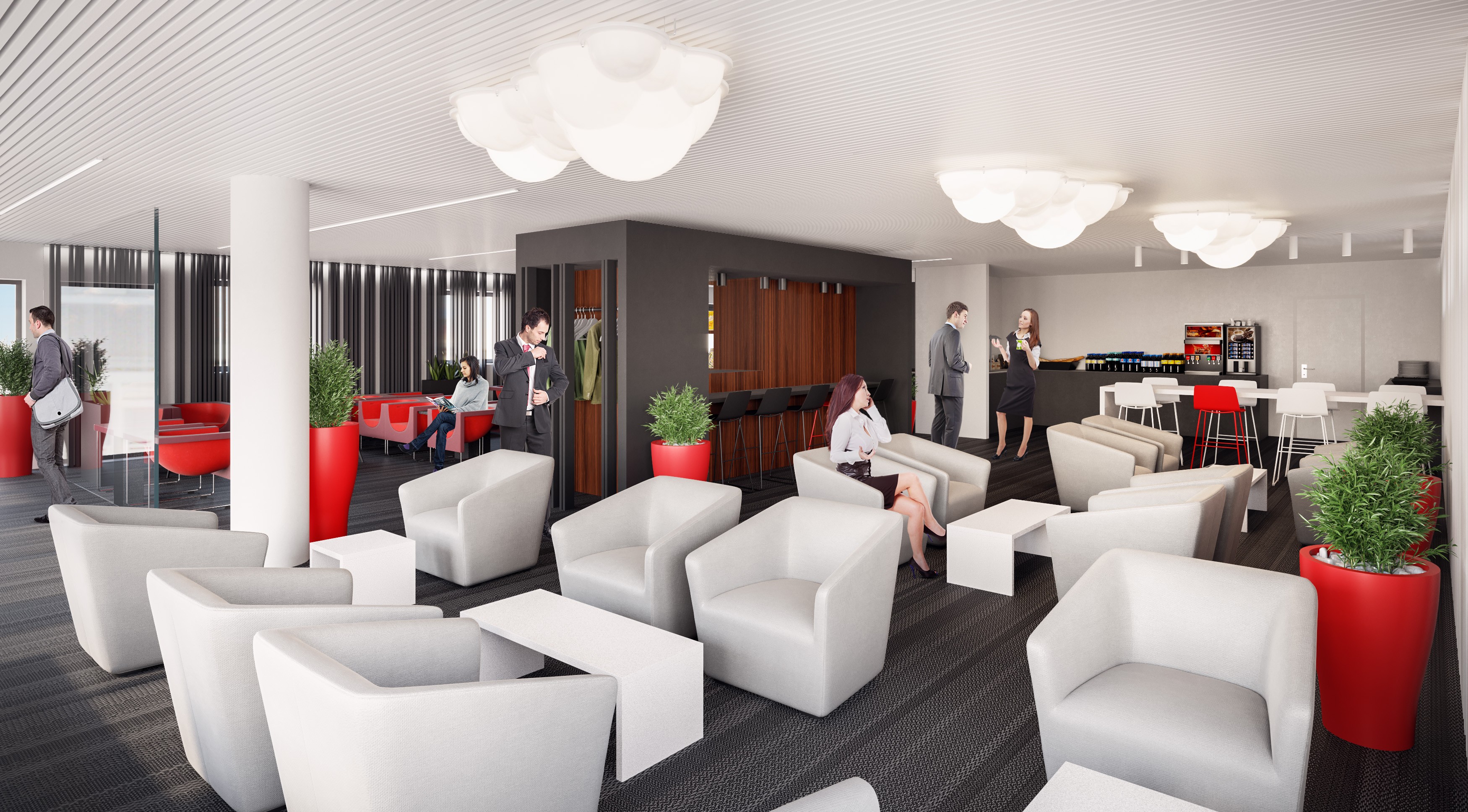 Dès l’entrée, une petite touche belge et humoristique accueille les passagers : les chapeaux melons. Présents également à la sortie, ils marquent le passage entre l'espace lounge et la zone d'embarquement.